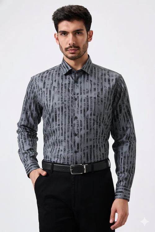 Cotton Gray Color Lining Brush Stroke Print Men Shirt